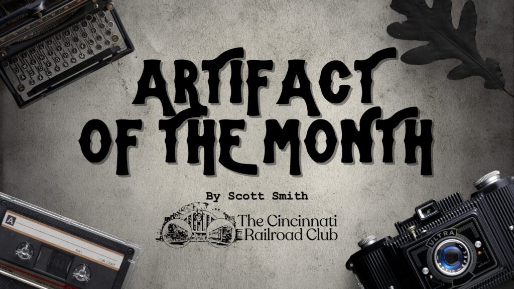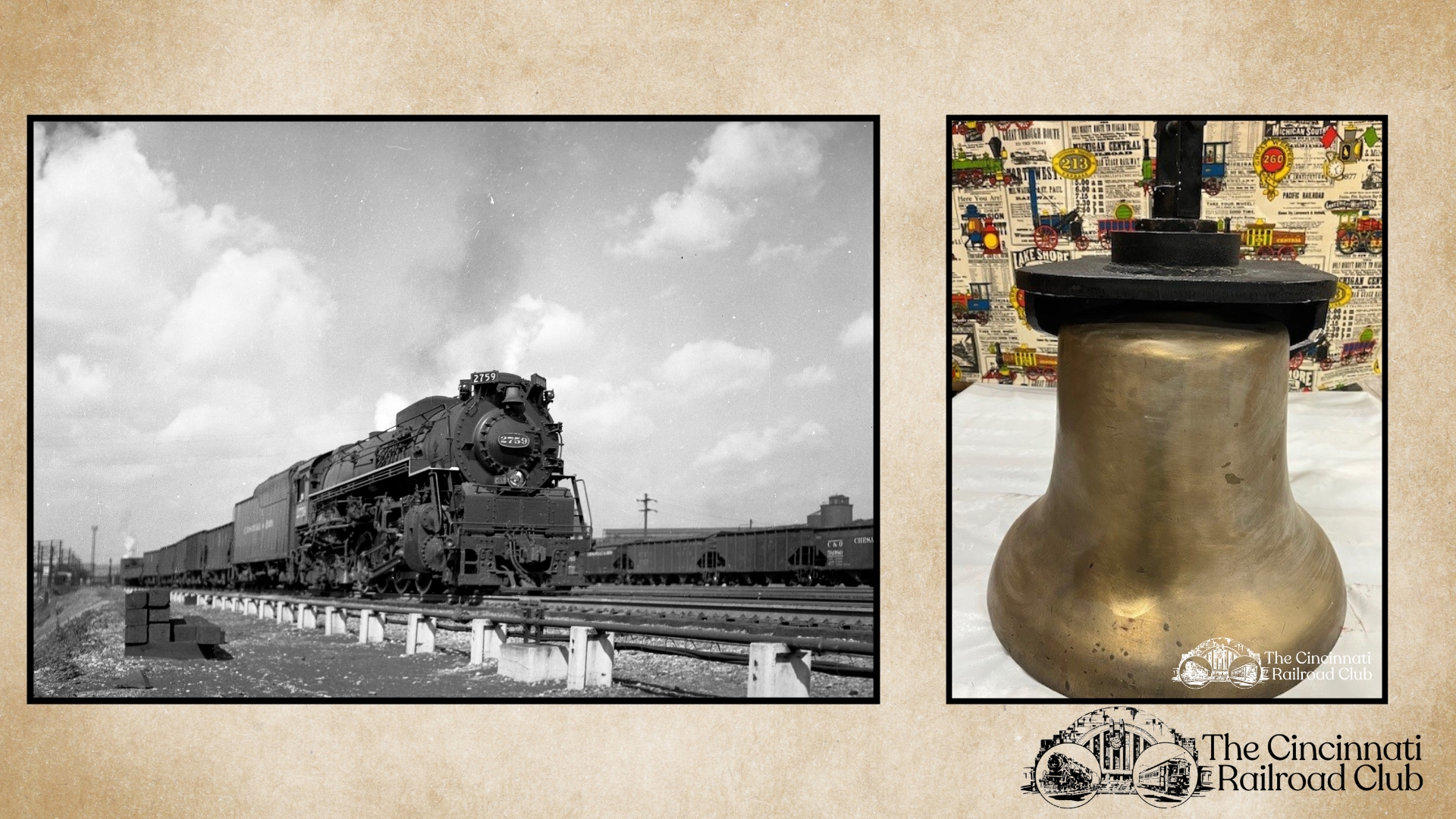 The Cincinnati Railroad Club presents the artifact of the month for March. This is a relatively new acquisition for the club’s collection. We showcase the bell from the Chesapeake and Ohio locomotive number 2759. This locomotive was a Kanawha 2-8-4, K-4 Class, and was manufactured in Lima, Ohio. Designed to burn soft coal, with a boiler pressure of 245 LBS, the tender capacity was 21,000 gallons. Driving wheel diameter: 69 inches. The 2759 was included in a production run of 10 locomotives, 2750-2759. The Kanawhas get their name from the Kanawha River in West Virginia. Here we see the 2759 in 1948, hard at work in Russell, Kentucky. Photo credit to Gene Huddleston and the Chesapeake and Ohio Historical Society.